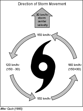 This is because the speed of the storm must be added to the wind speed. (see diagram) The stronger the wind the greater the storm surge will be.